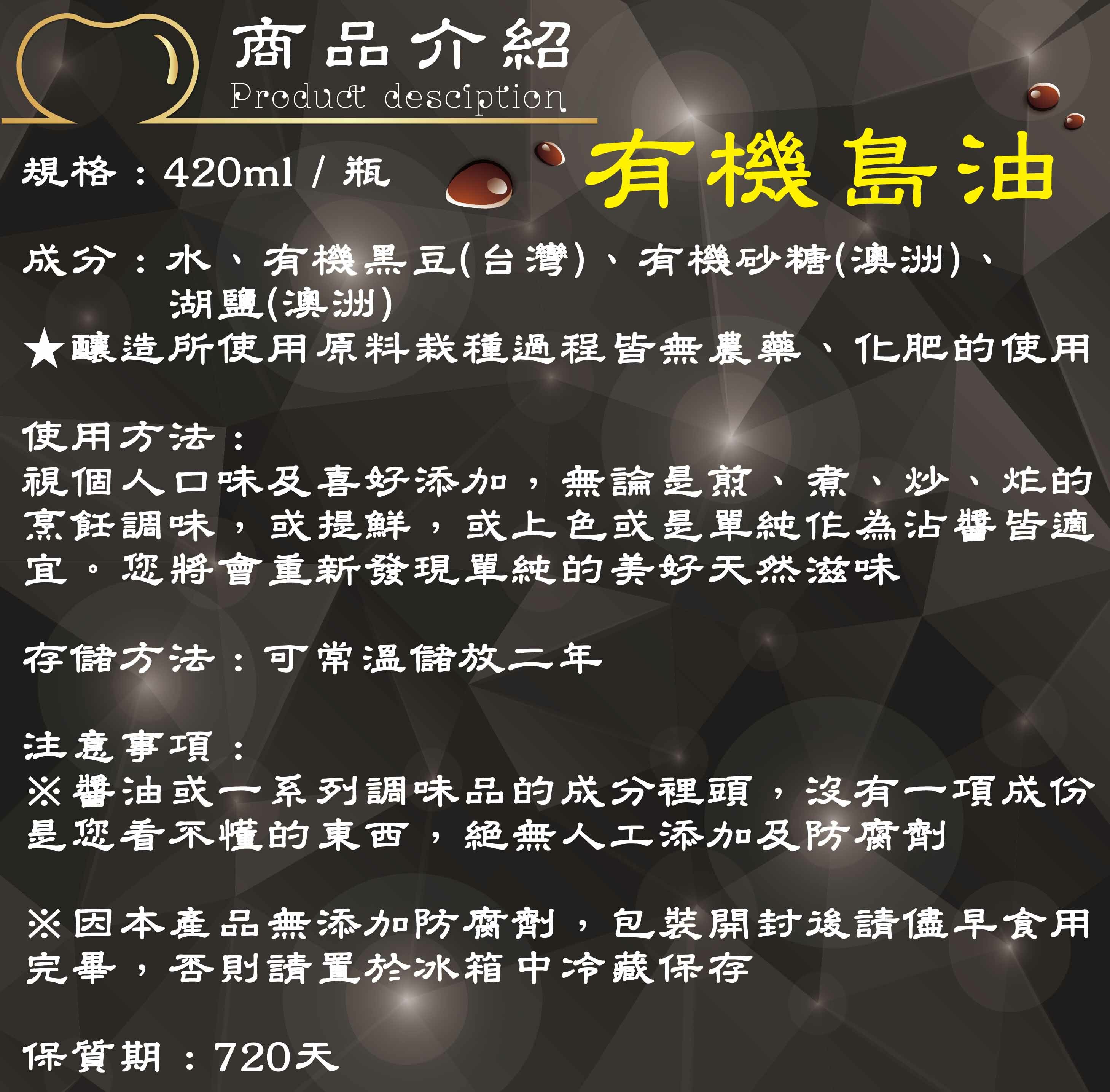 特色: 精選完整本土有機黑豆,遵循古法純釀造,經陶甕日曝四至六個月自然發酵而成