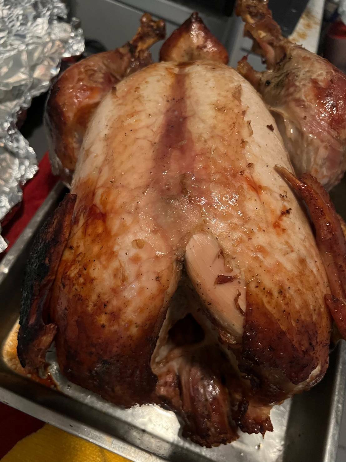 3. 將火雞和托盤完全包裹在錫箔紙內,放進烤箱烘烤